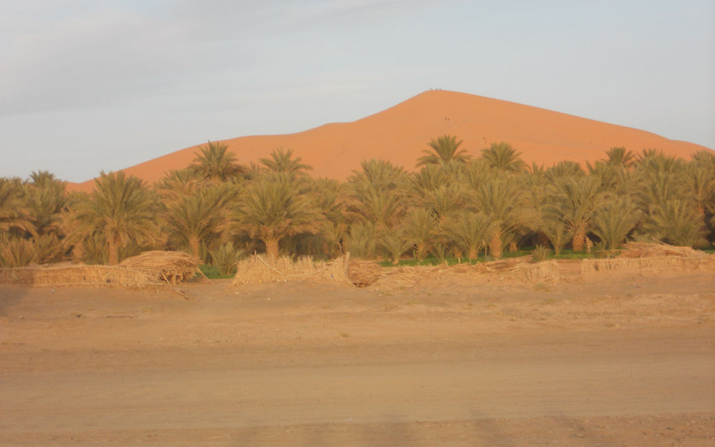 Di fronte alle sinuose dune sorge una piccola oasi e il grazioso villaggio di Hassi Labied, abitato dalle genti del deserto, i Berberi o Amazighen, uomini liberi, come loro più poeticamente si definiscono. Qui le case sono costruite tutte nella maniera tradizionale: con paglia e terra essiccata al sole e i colori delle abitazioni si confondono con quelli della sabbia del deserto. L’oasi con il suo palmeto, al cui interno si può passeggiare, si trova di fronte al villaggio, è sovrastata dalla “Grande Duna” e divisa in piccoli campi coltivati dalle popolazioni del villaggio.
