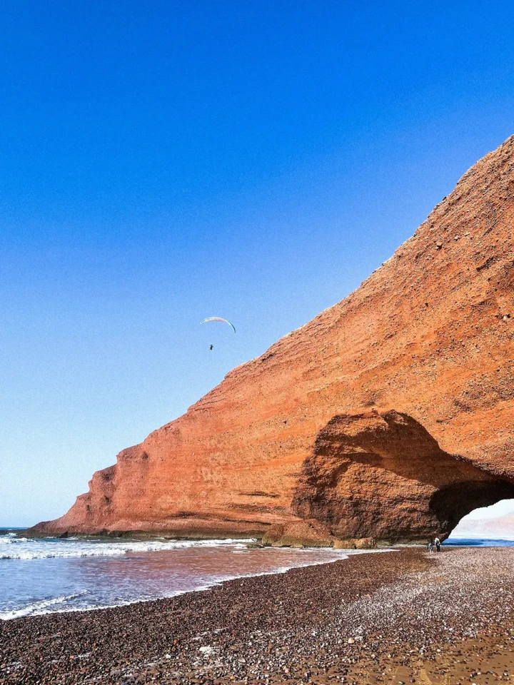Famosa per i suoi maestosi archi naturali di roccia rossa scavati dall’erosione marina, Legzira offre uno spettacolo visivo unico, specialmente al tramonto, quando la luce infuoca la pietra rendendo il paesaggio quasi marziano.